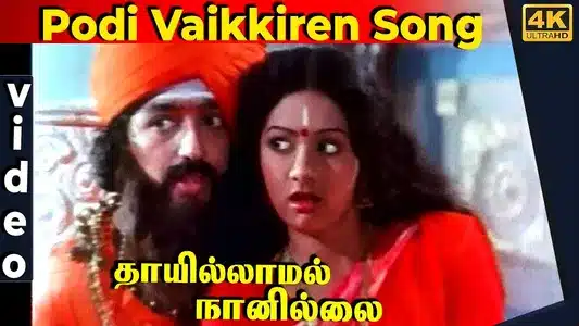 S. P. Balasubrahmanyam performs ‘Podi Vaikkiren Sokkupodi’ in the film Thaayillamal Naan Illai. Lyricist Vaali and composer Shankar Ganesh craft a folk-driven declaration of romantic certainty. The track balances playful magic metaphors with steady rhythmic conviction.
